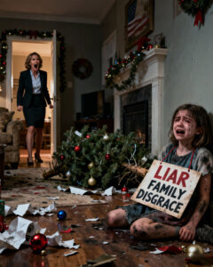 Seguí la dirección y me quedé helada. Allí estaba: mi hija de siete años, de pie en un rincón. Su vestido elegante estaba rasgado y manchado de suciedad. En su frente, alguien había garabateado MENTIROSA con marcador negro. Alrededor de su cuello colgaba un letrero de cartón: DESHONRA DE LA FAMILIA. Su pequeño cuerpo temblaba y sus ojos se llenaron de lágrimas.